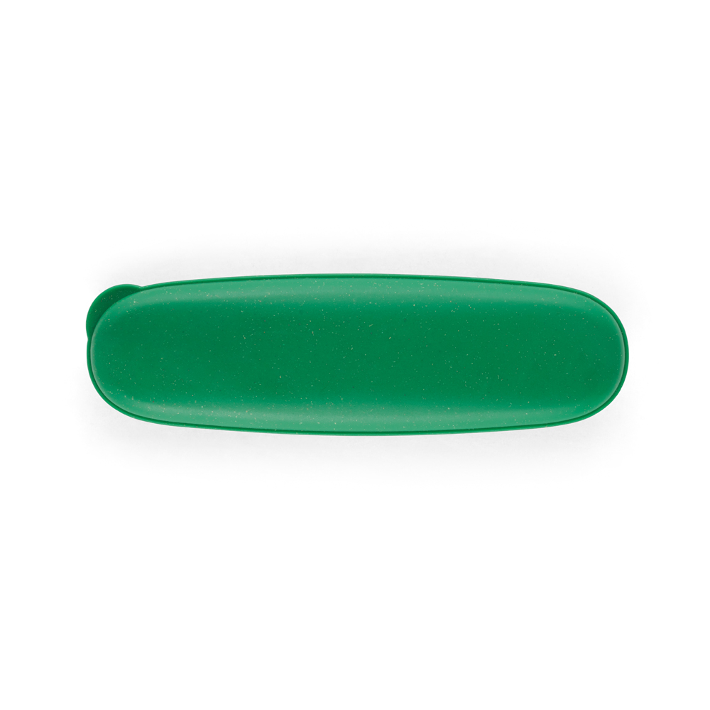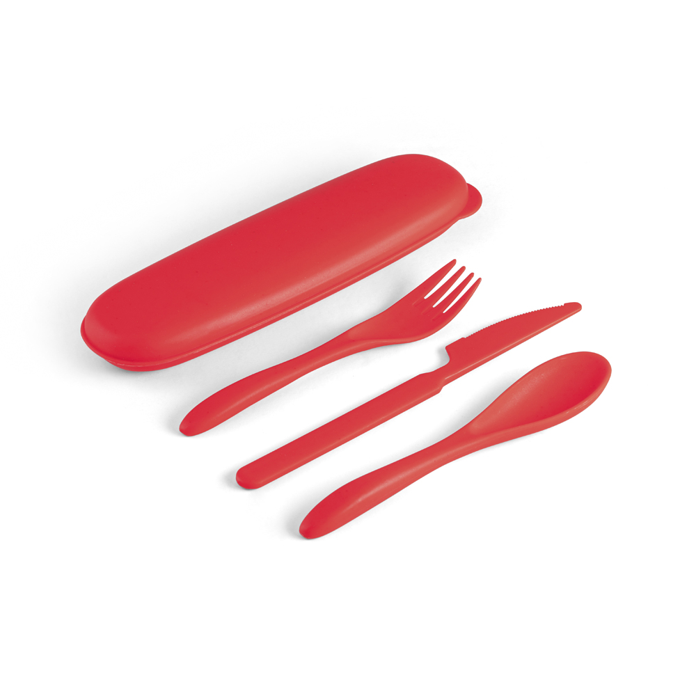 Conjunto de talheres produzido em fibra de bambu e PP, possui 3 talheres: garfo, faca e colher, incluso estojo, medidas 205 x 65 x 25 mm. Gravação serigrafia em 1 cor no estojo.