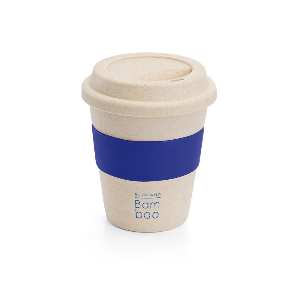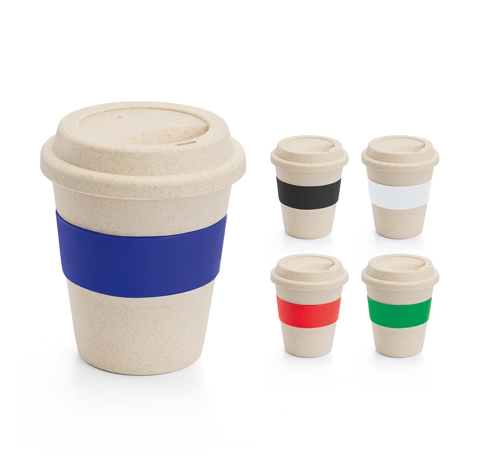 Copo produzido em fibra de bambu e PP com banda em silicone, capacidade: 380 ml, Retirar tampa antes de colocar no micro-ondas, medidas Ø95 x 114 mm. Gravação serigrafia em 1 cor.