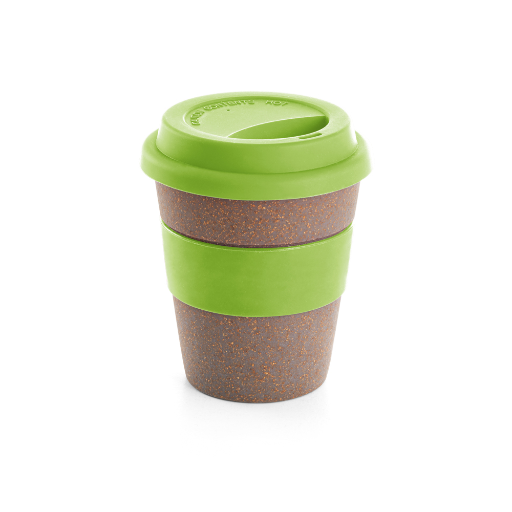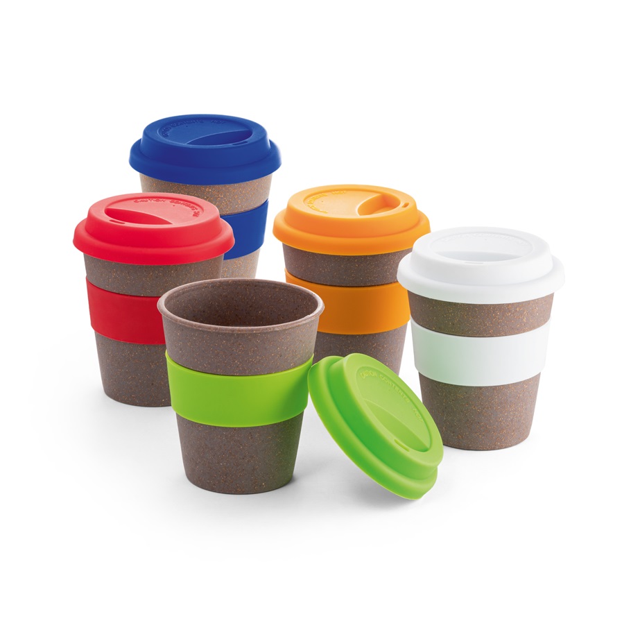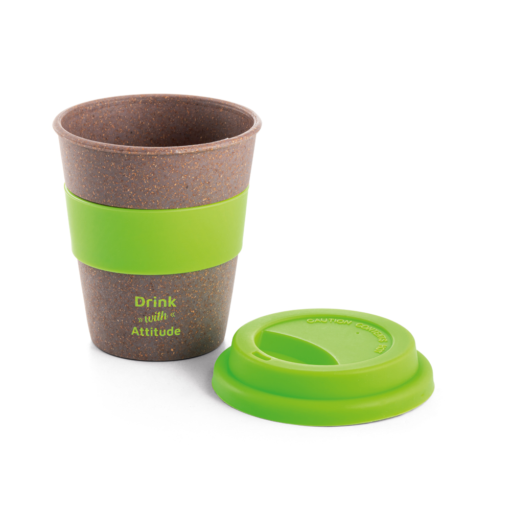 Copo produzido em fibra de bambu e PP, possui tampa e banda em silicone, capacidade: 390 ml ( Retirar tampa antes de colocar no micro-ondas), medidas Ø95 x 113 mm. Gravação serigrafia em 1 cor.