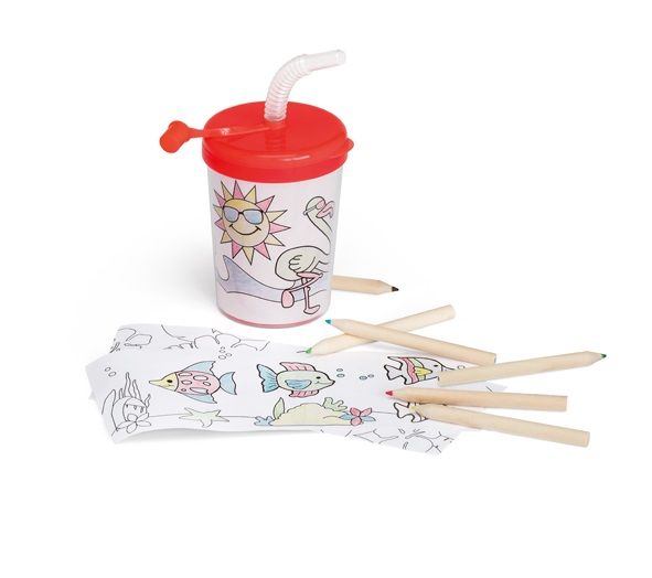 Copo plástico capacidade: 200 ml. produzido em PP e PS, com palhinha flexível e canudo, possui 3 desenhos para colorir e 6 mini lápis de cor inclusos, medidas ø72 x 98 mm. Gravação serigrafia em 1 cor.