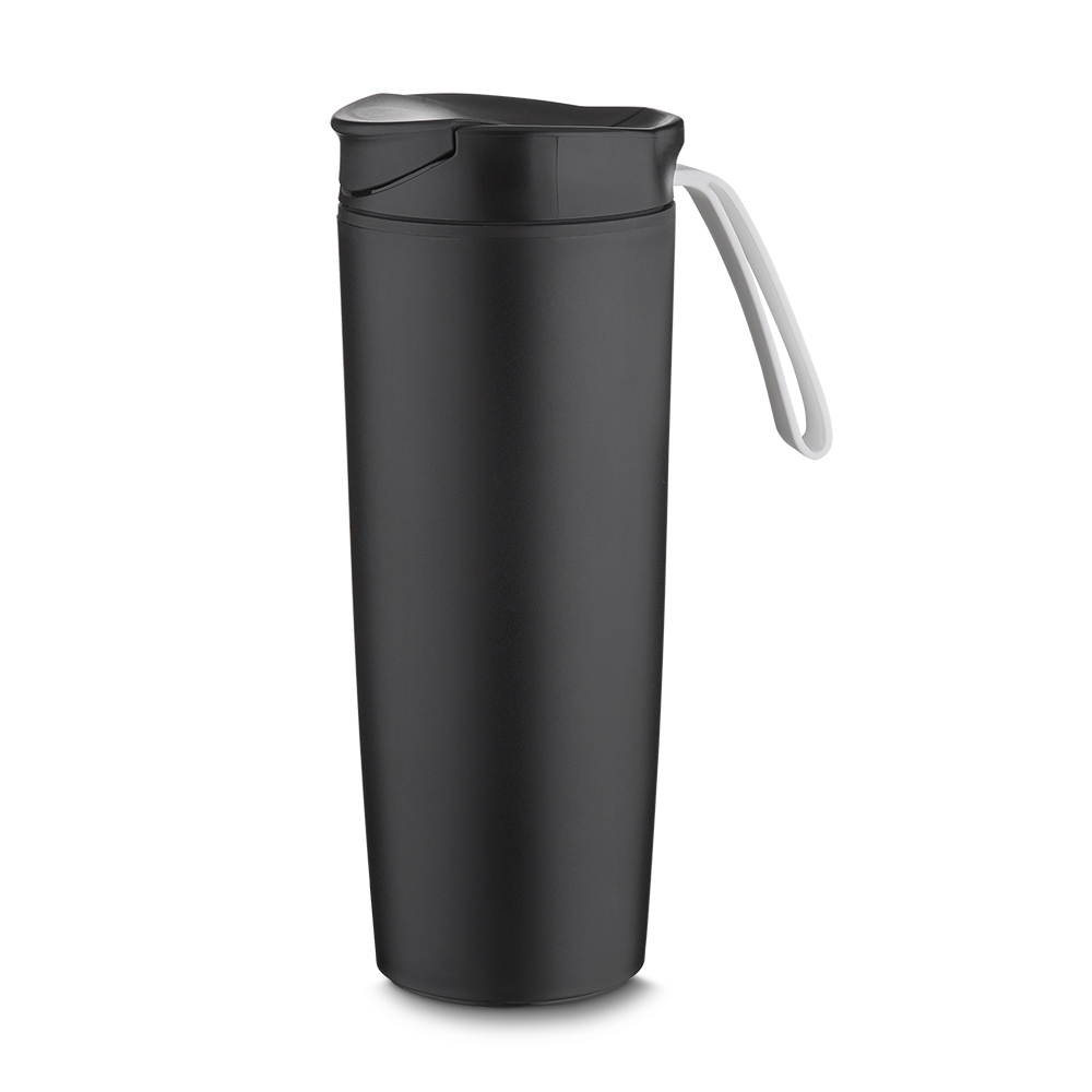 Copo plástico anti queda 400 ml de pintura preto fosco com alça emborrachada colorida. Tampa rosqueável com abertura de bocal, parte inferior do produto possui ventosa, medidas (C x L): 22,2 cm x 8,6 cm x 26,1 cm. Gravação serigrafia em 1 cor.