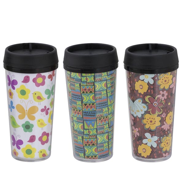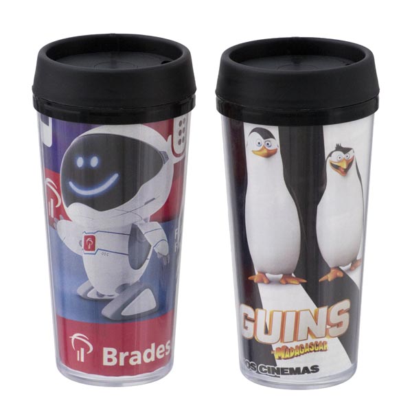 Copo plástico de alta qualidade, corpo em PS Cristal e tampa em PP, atóxicos, capacidade 500 ml. Parede dupla que conserva mais a temperatura dos líquidos. Tampa removível com disco giratório sistema abre/fecha. Personalização interna por arte Cromia 360 º.
