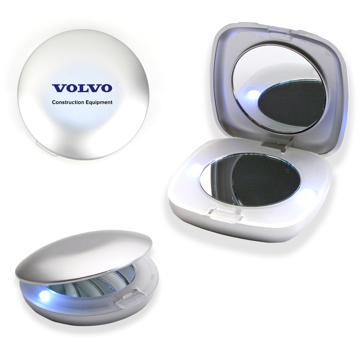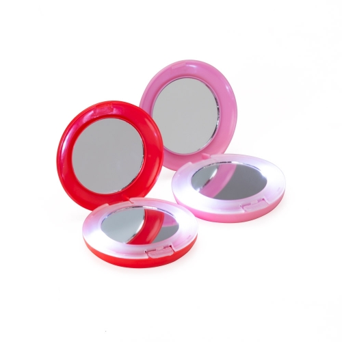 Espelho de bolsa duplo, plastico redondo ou quadrado com Luz. Gravação serigrafia em 1 cor.