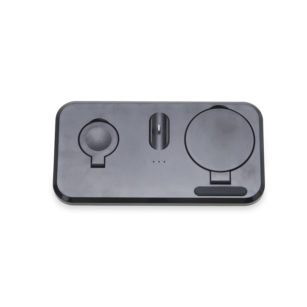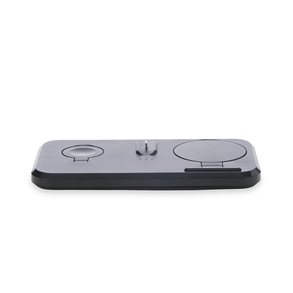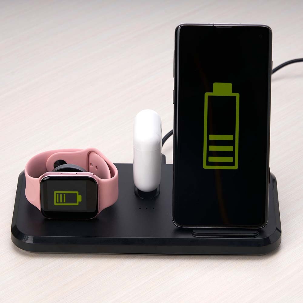 Estação de carregamento 3 em 1 para celular, iwatch e fones com entrada Lightning. Com sistema de carga por indução rápida, a estação permite o carregamento sem fio de celulares e iwatchs habilitados com estas tecnologias, além destes suportes, a estação conta ainda com um carregador para fones através do conector Lightning. Sua base contém tapetes de silicone antiderrapantes. Acompanha cabo USB tipo-C.