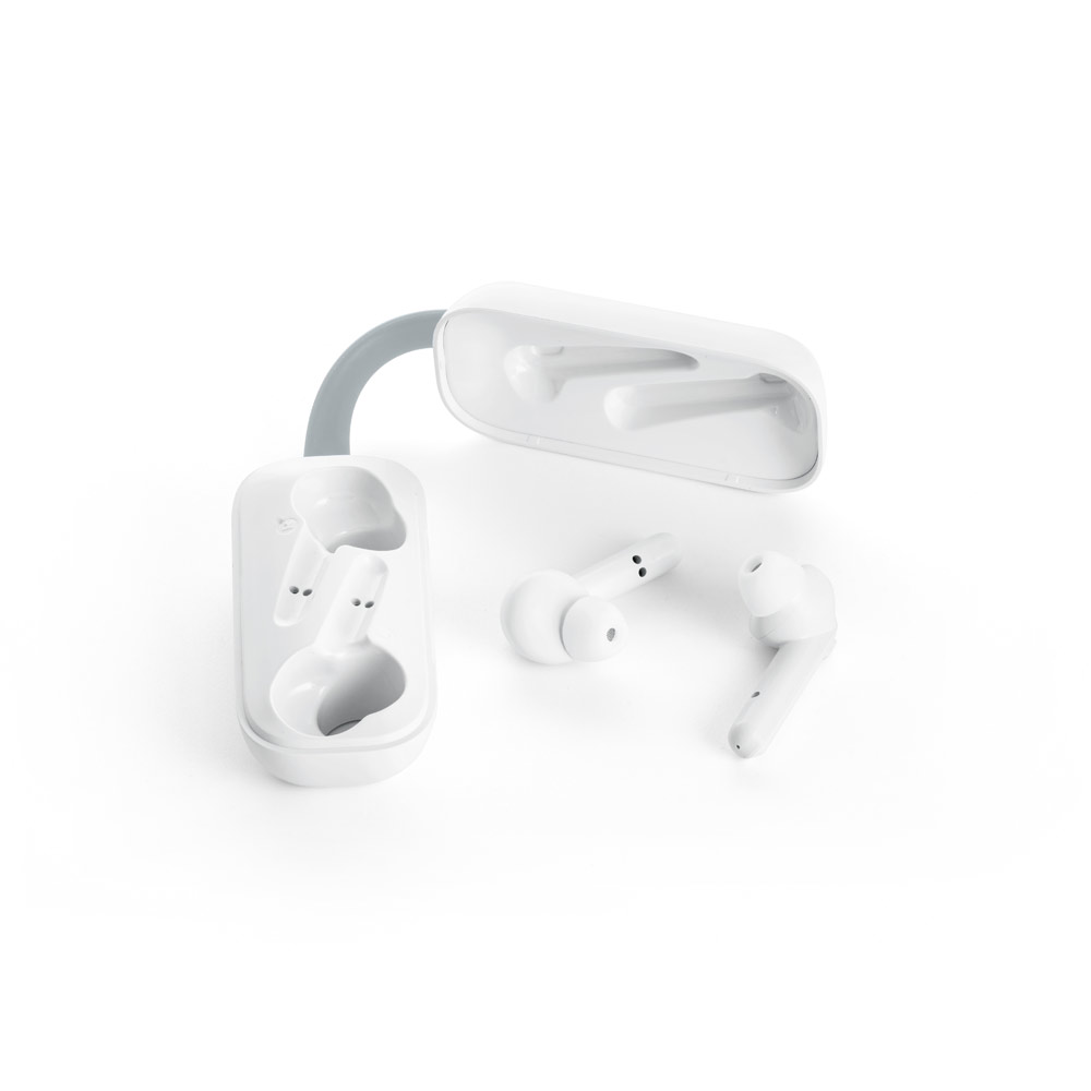 Fones de ouvido wireless stereo em ABS com transmissão por bluetooth 5.0 e tempo de reprodução de 3 horas. O estojo de carregamento, com uma bateria 250 mAh, é também em ABS e contém uma presilha em silicone que permite transportar e carregar os fones de forma fácil e confortável. Produto com cabo de carregamento micro USB incluso, foornecido em caixa presente.