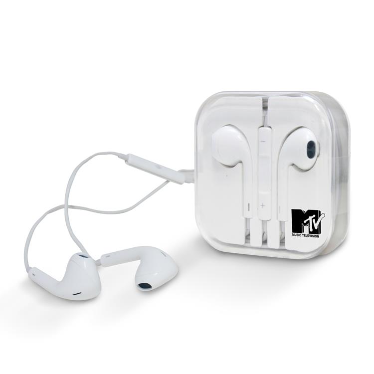 Fone de ouvido estéreo com microfone e controle de volume. Fone de ouvido plástico na cor branca, entrada P2, possui indicativo L(left) e R(right) na área interna do fone, detalhes internos vazados no fone(possibilita a visão da tela de proteção), microfone acoplado no suporte com desenho indicativo e no verso do suporte controle de volume com desenho indicativo – e +. Acompanha embalagem plástica branca com tampa acrílica transparente. OBS.: Botões de volumes funcionam apenas em aparelhos da linha APPLE. Gravação serigrafia em 1 cor.