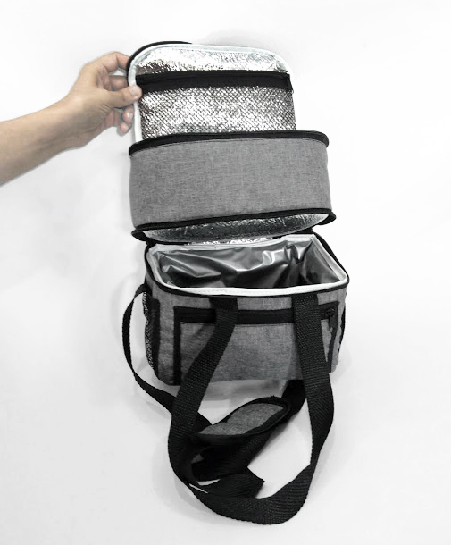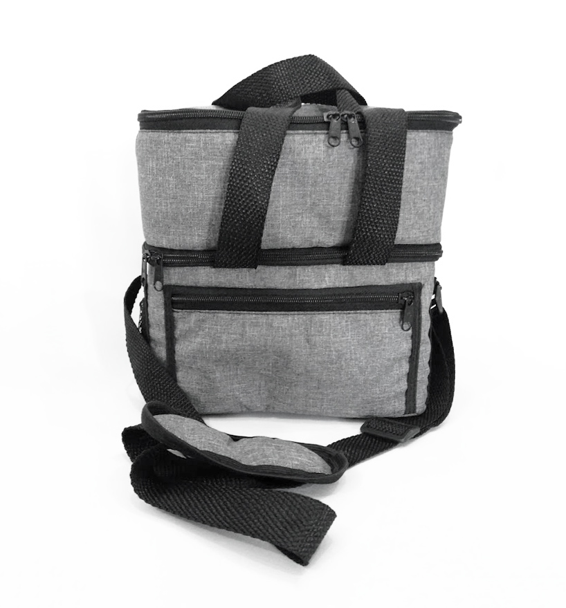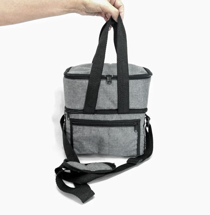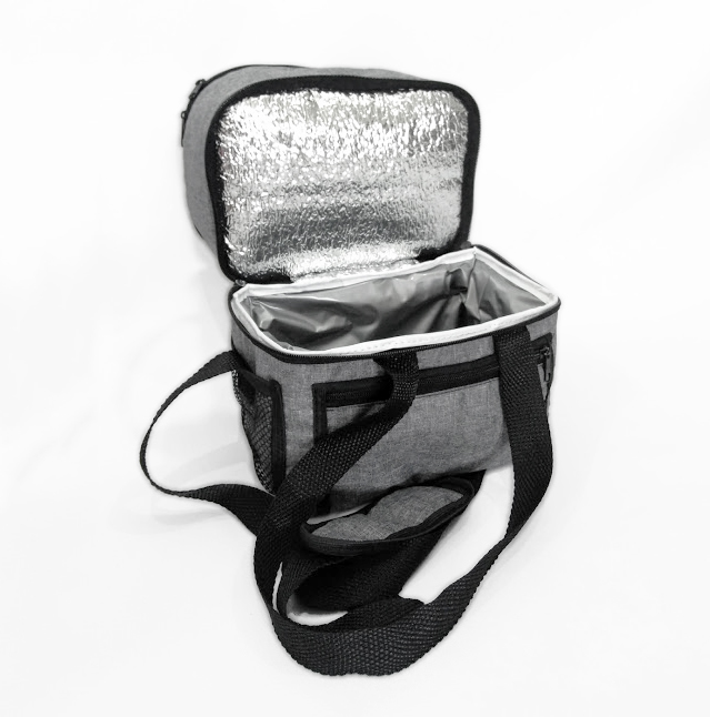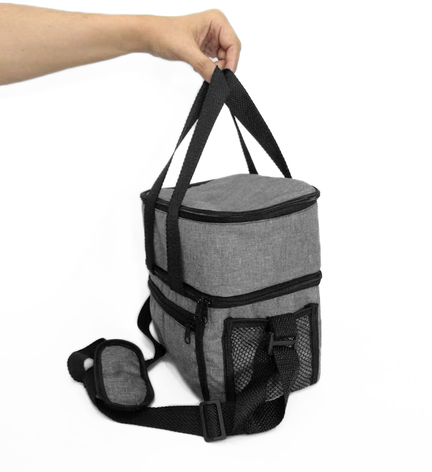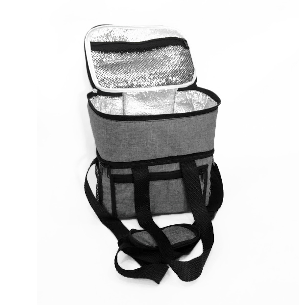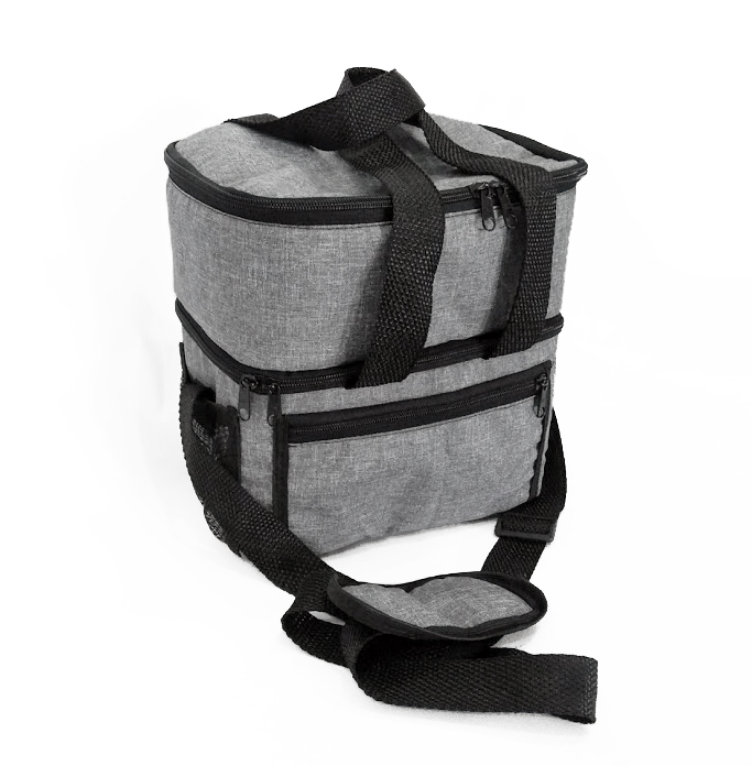Frasqueira Térmica capacidade 9,4 litros com alça de mão e ombro com 2 andares, sendo primeiro andar com acabamento soldado para produtos frios, e segundo andar com forro metalizado para produtos quentes , possui bolso externo frontal fechamento com zíper e dois bolsos laterais em tela. Medidas 24×24,5×16 cm, gravação serigrafia em 1 cor.