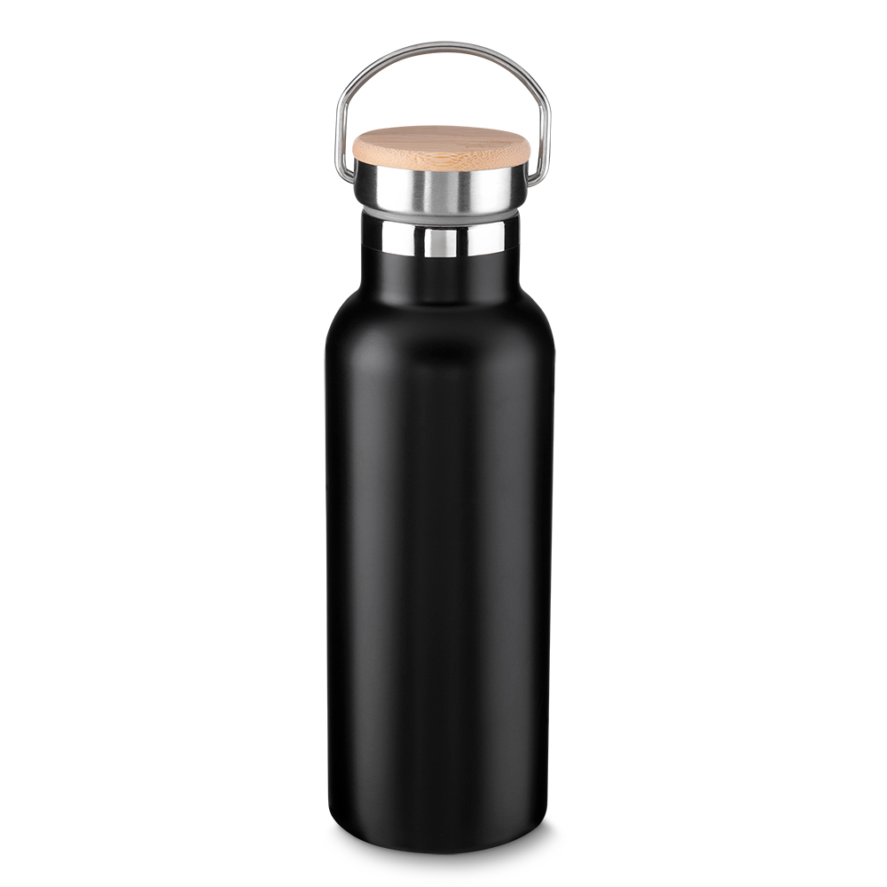 Garrafa térmica pintura fosca em aço inox com parede dupla isolada a vácuo, com capacidade de até 500ml. Conserva líquido quente por até 8 horas e líquido frio até 12 horas. Tampa com revestimento em fibra de bambu, alça em metal com detalhe cromado.