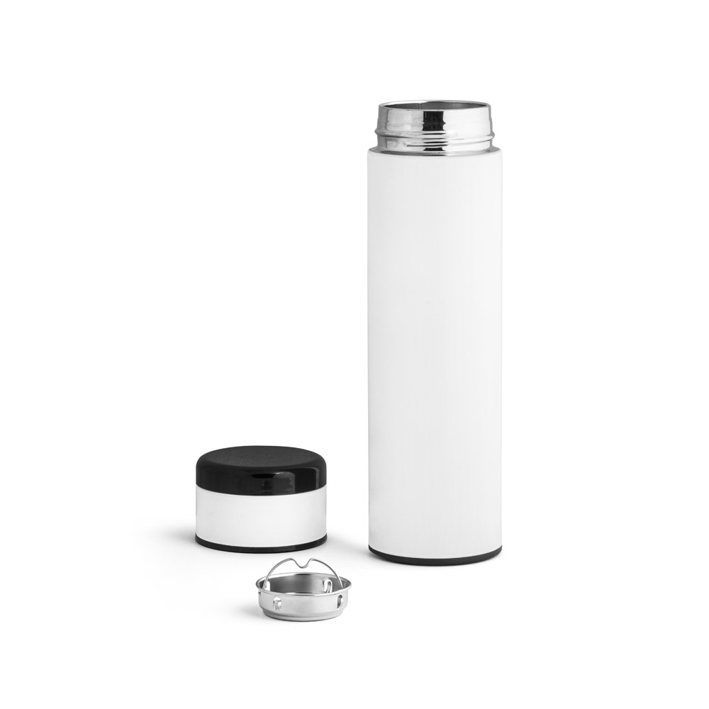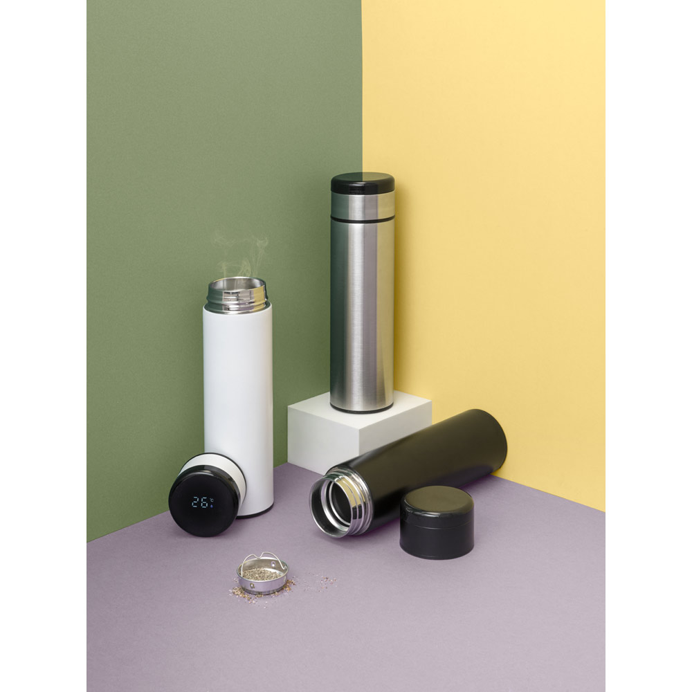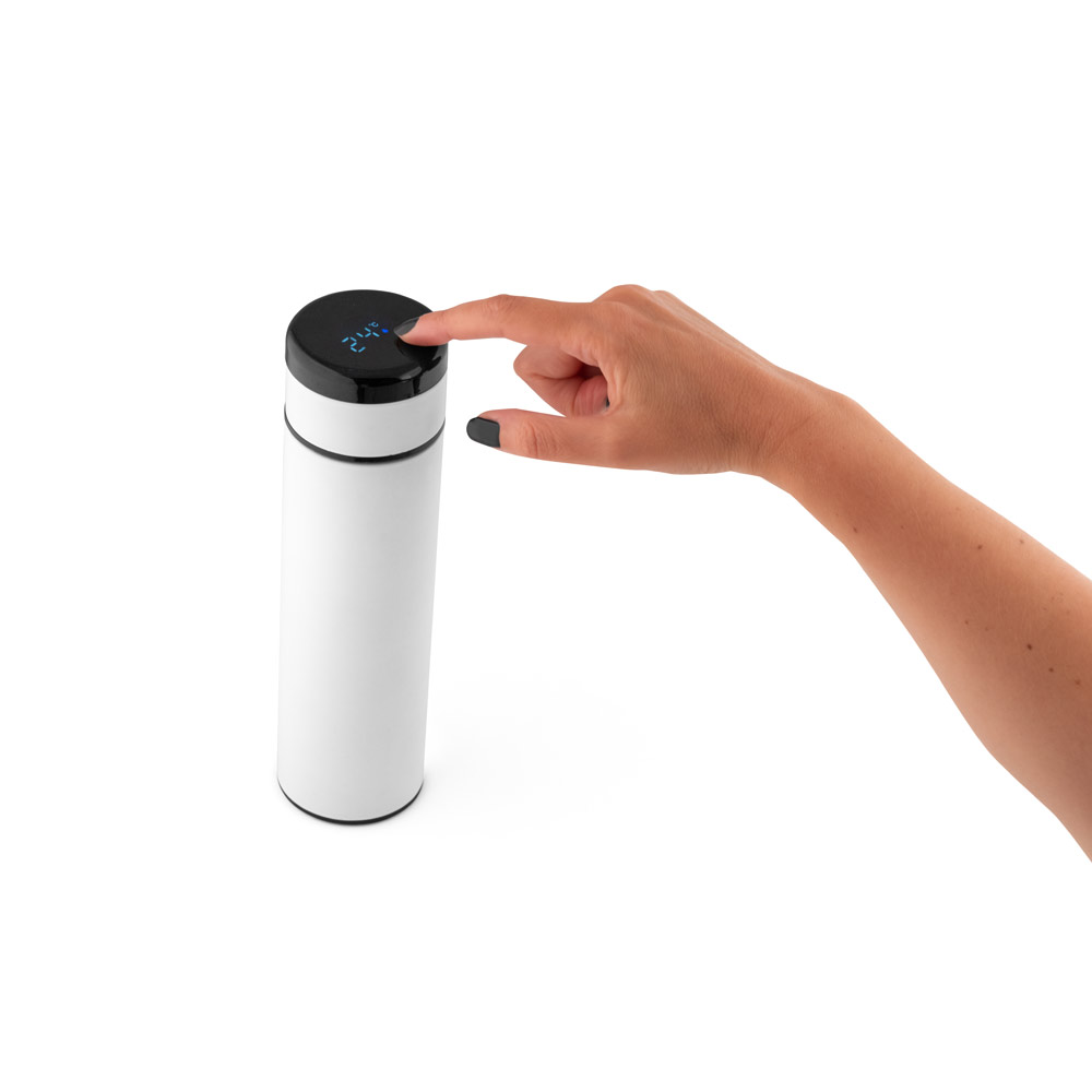 Garrafa térmica de 450ml corpo com parede dupla em aço inox. A tampa tem incorporado um termômetro digital que permite, com um simples toque, saber a temperatura do líquido no interior da garrafa. Incluso na tampa um sistema de fácil acesso à bateria para substituir quando necessário. Capacidade da bateria: CR2450. medidas ø65 x 235 mm. Gravação a laser.