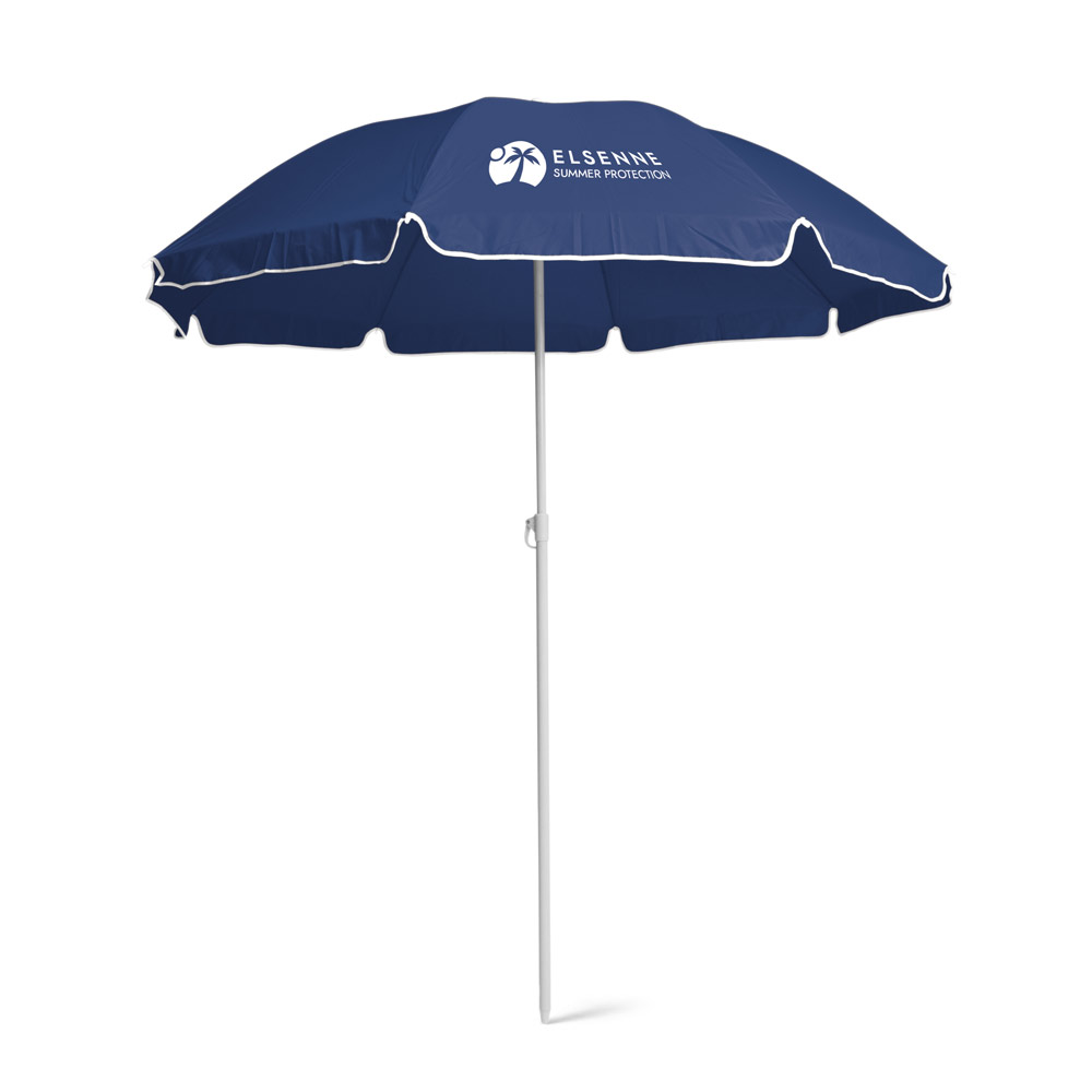 Guarda-sol 1,40 m diâmetro produzido em poliéster 170T, com haste central em ferro com pintura branca, incluso capa para transporte. Gravação serigrafia em 1 cor em 4 gomos.
