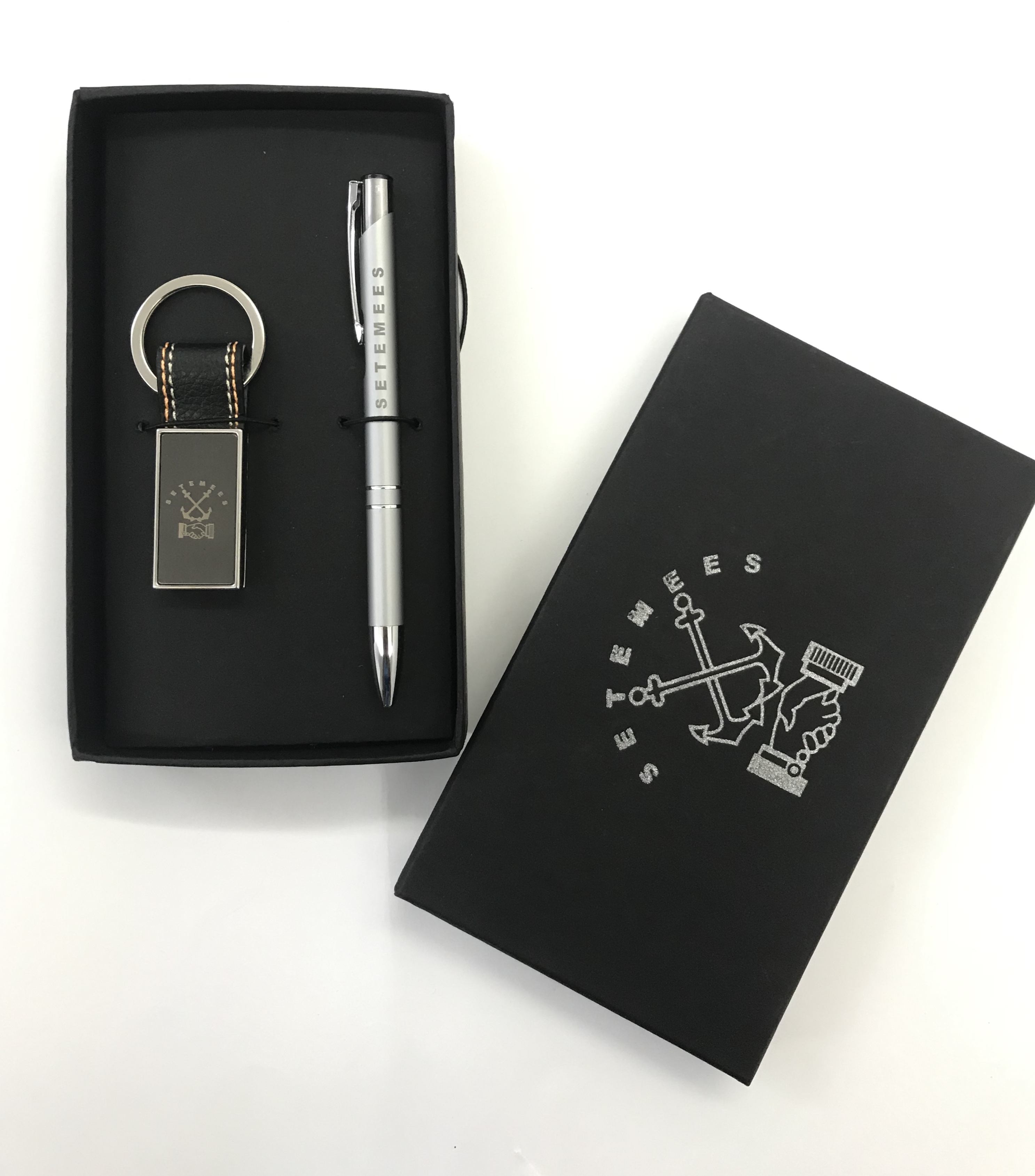 Kit incluso caneta metálica e chaveiro com detalhes em sintético. Gravação a laser na caneta, chaveiro e serigrafia em 1 cor na caixa.