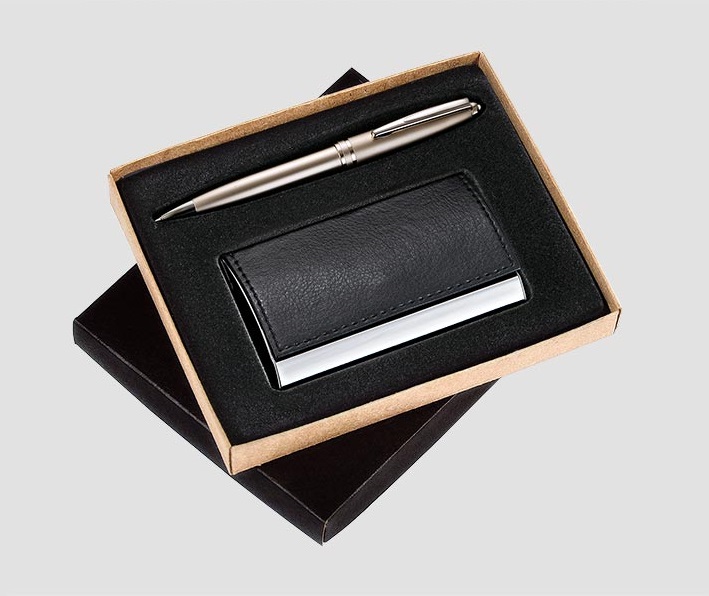 Dimensões do porta cartão: 9,8 x 6,5 x 1 cm . Incluso caixa em papelão para acomodar os itens. Gravação a laser na caneta e porta cartão, e serigrafia em 1 cor na tampa da caixa.