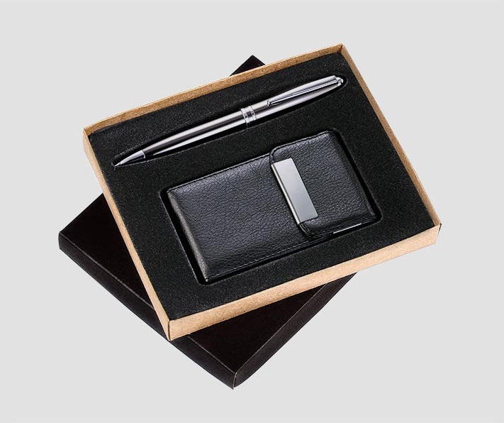 Conjunto com caneta em Metal Ônix e porta cartão em Material Sintético/Metal Ônix. Incluso embalagem com berço para caneta e porta cartão. Gravação a laser nos dois itens.