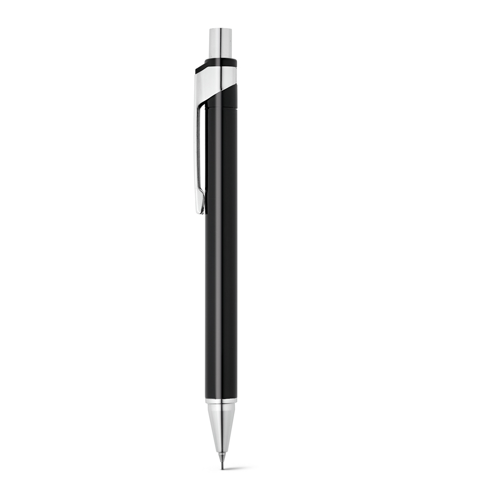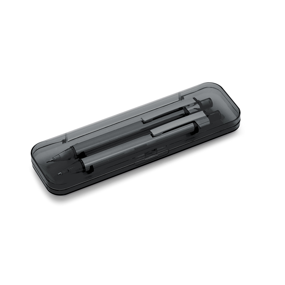 Conjunto de caneta esferográfica e lapiseira de alumínio, lapiseira: grafite 0.7. Incluso estojo medidas 165 x 50 x 24 mm. Gravação a laser caneta e lapiseira.