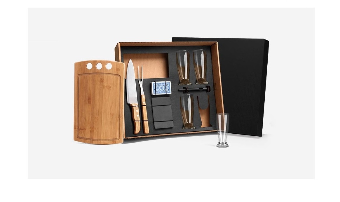 Conjunto para Churrasco / Cerveja / Truco. Acompanha tábua com três furos em Bambu; faca 8” e garfo em Bambu/Inox; quatro copos de cerveja em Vidro; bloco de anotação; caneta esferográfica; jogo de cartas. Gravação a Laser nos copos, na tábua, na lâmina da faca e na tampa da caixa. Incluso caixa com berço para os itens.