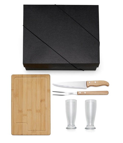 Kit Churrasco com tábua em bambu; faca e garfo em inox / bambu; 2 copos em vidro.