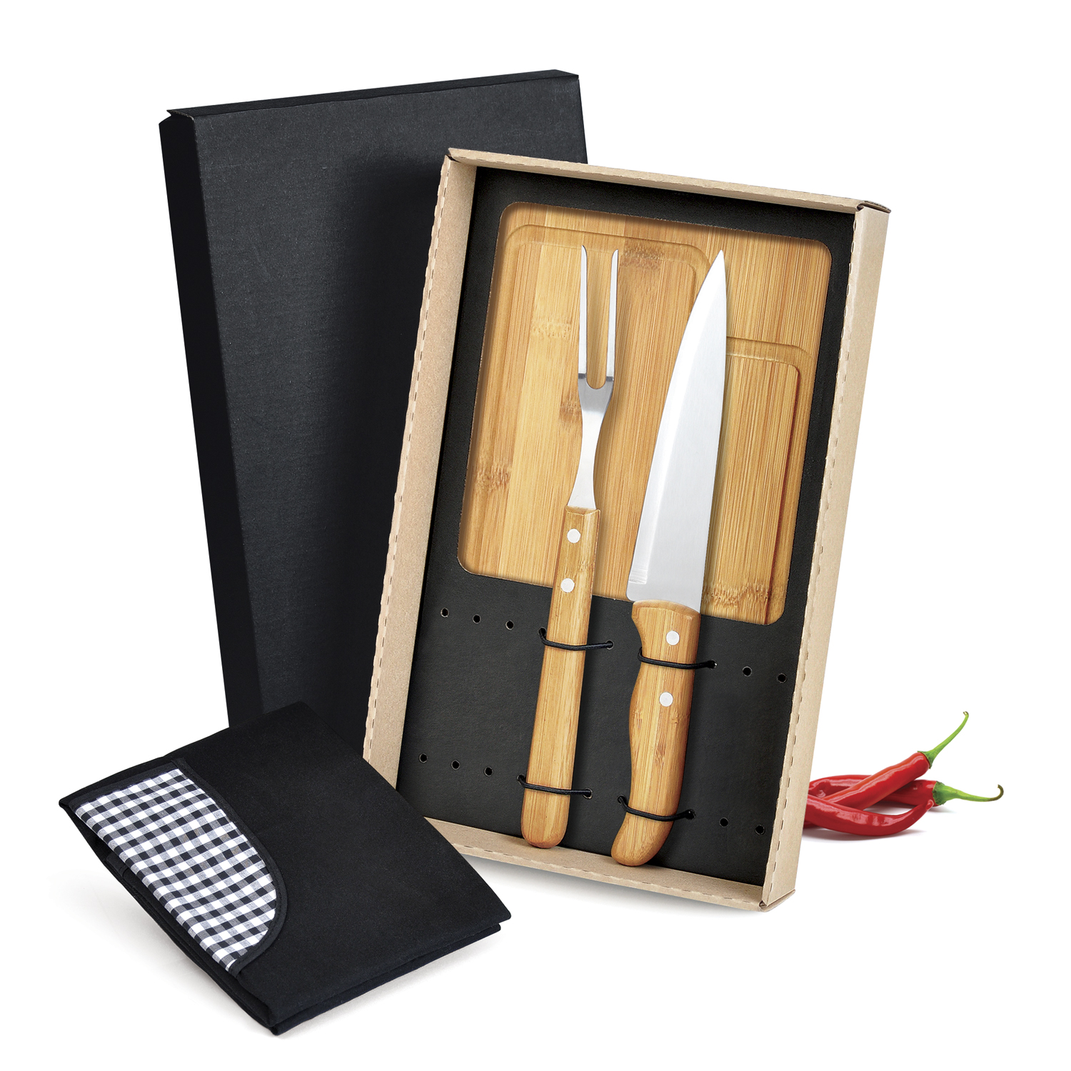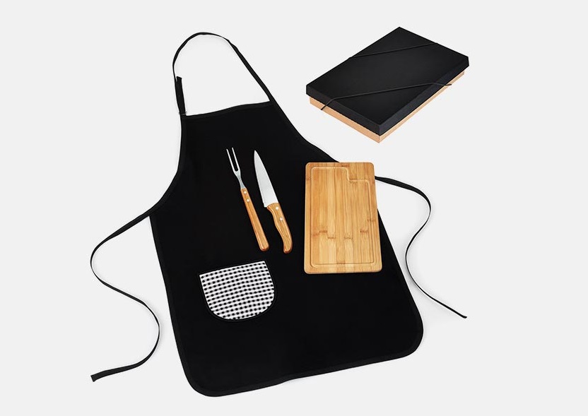 Acompanha avental em Brim, tábua em Bambu com sulco, faca 7” e garfo em Bambu/Inox.Uma gravação a Laser na tábua e na lâmina da faca e em Silk screen no avental. Como cortesia, na faca 7″ fazemos uma gravação com os cortes do boi.