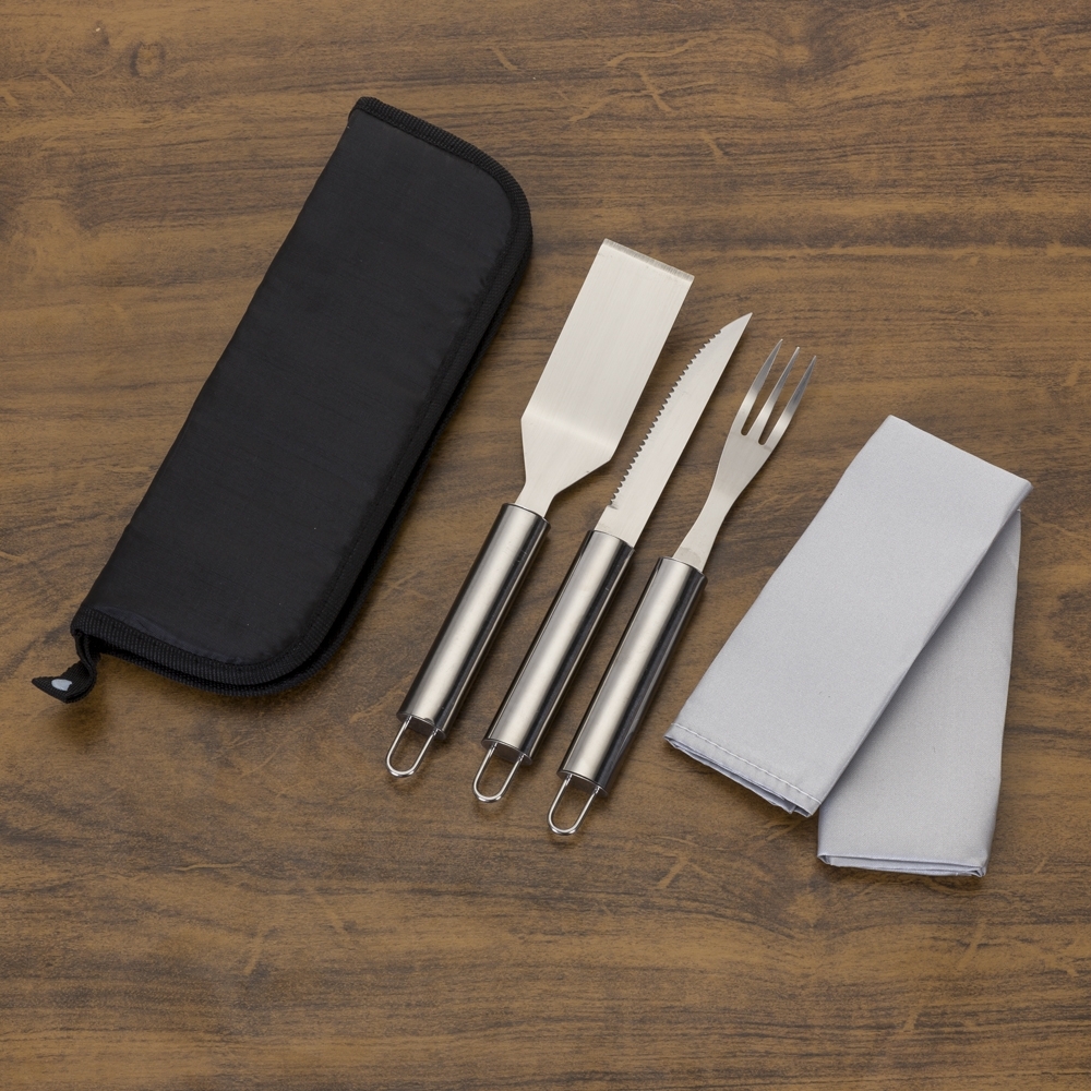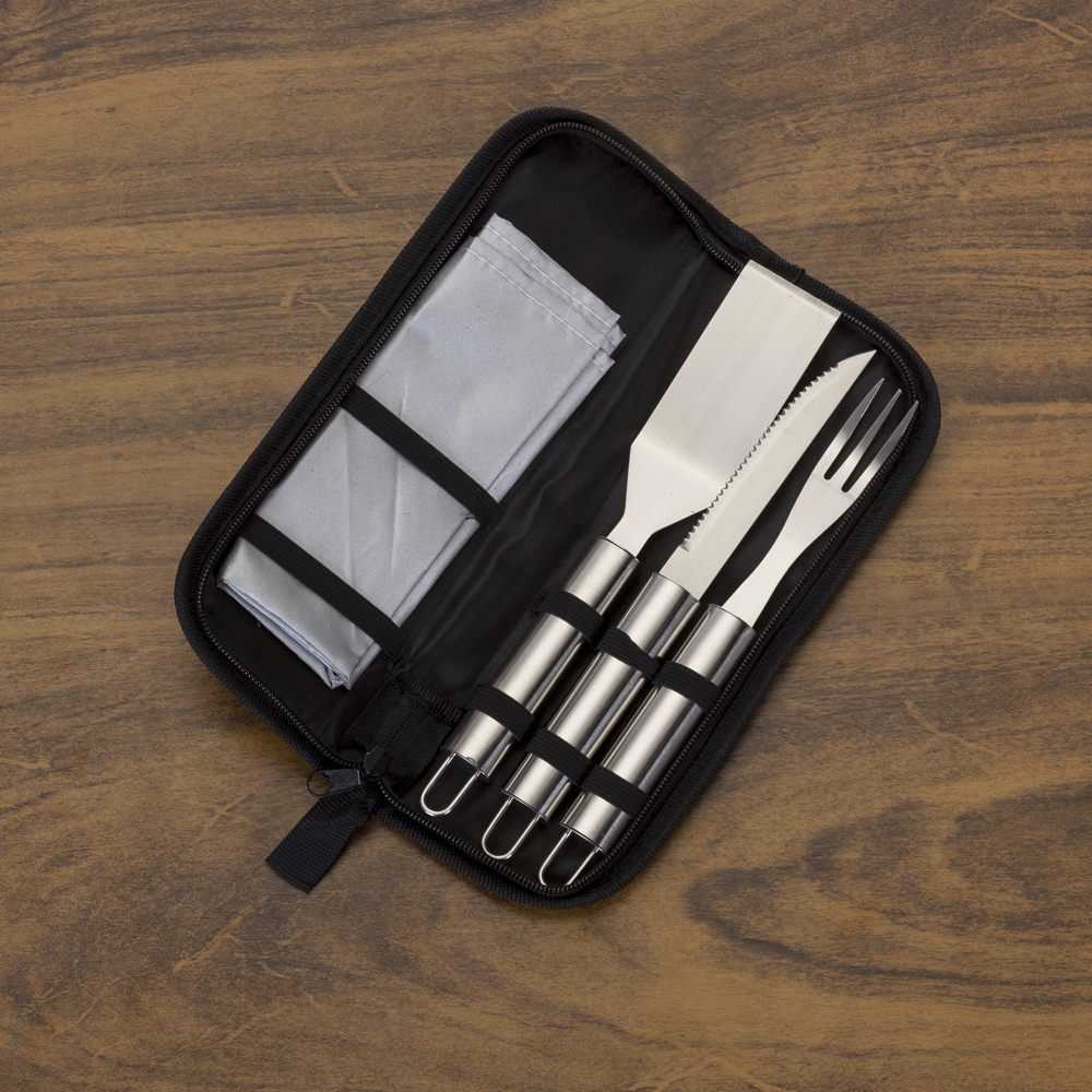 Kit churrasco com 5 peças em estojo de nylon com alça. Possui: 2 jogos americanos, espátula, faca e garfo. Acompanha proteções plásticas e parte interna com elástico para guardar as peças, Medidas : Altura : 26,4 cm x Largura : 9,5 cm. Gravação serigrafia em 1 cor no estojo e laser nos talheres.