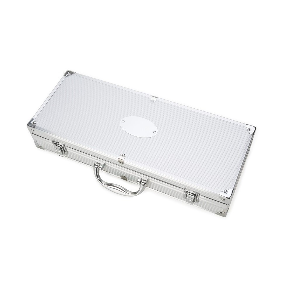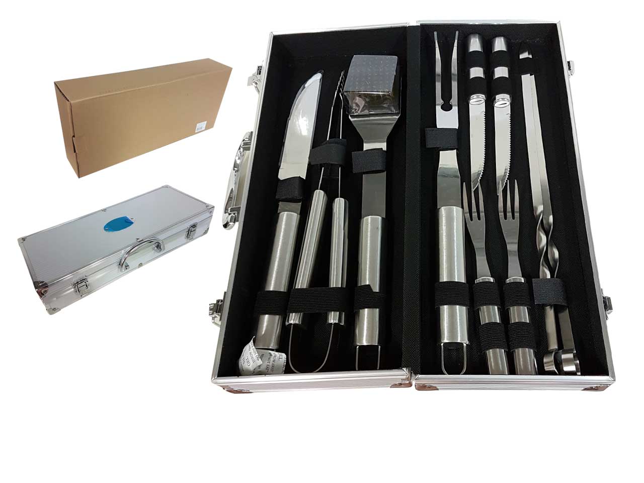 Kit churrasco 10 peças em maleta de alumínio com relevo. Possui: faca, pegador, escova(com proteção plástica), garfo, duas facas de serra pequenas, dois garfos pequenos e dois espetos. Detalhes em metal nas bordas da maleta, duas dobradiças na parte inferior, uma alça e duas presilhas para travar/abrir maleta. Parte interna revestida de tecido tnt e velcro para guardar as peças.