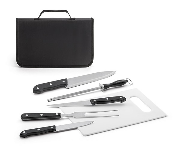 Kit churrasco produzido em aço inox e PP, possui tábua, 3 facas, chaira e garfo acomodados em estojo de nylon 210D. Medidas do estojo: 350 x 230 x 40 m, medidas Tábua: 283 x 192 x 5 mm.