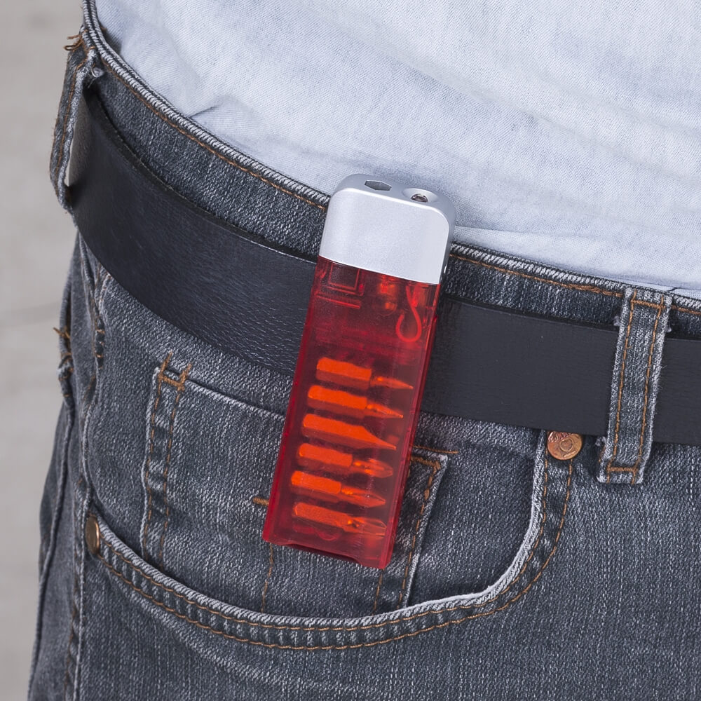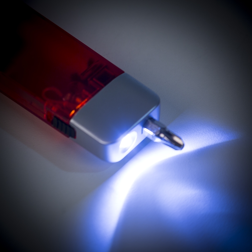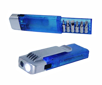 Kit ferramenta plástico com 6 peças e lanterna. Corpo fosco colorido, parte superior detalhe prata com suporte para as chaves e prendedor, lanterna e botão superior lateral para acender/apagar lanterna. Possui 3 chaves Philips e 3 chaves fenda, acompanha 3 baterias AG3. Chaves ficam em compartimento interno, basta pressionar a parte traseira que irá abrir uma espécie de “gaveta”, medidas (CxL): 9,8 cm x 3,4 cm. Gravação serigrafia em 1 cor.
