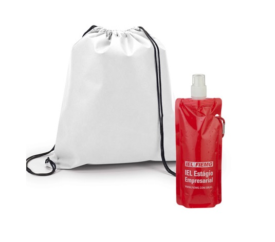 Kit Fitness incluso mochila sacola em nylon com cordão, e squeeze dobravel capacidade 400 ml. Gravação serigrafia em 1 cor na mochila e squeeze.