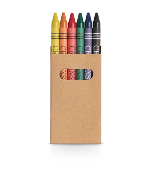 Conjunto com 6 gizes de cera em caixa kraft, medidas da caixa 53 x 92 x 9 mm. Gravação serigrafia em 1 cor na caixa.