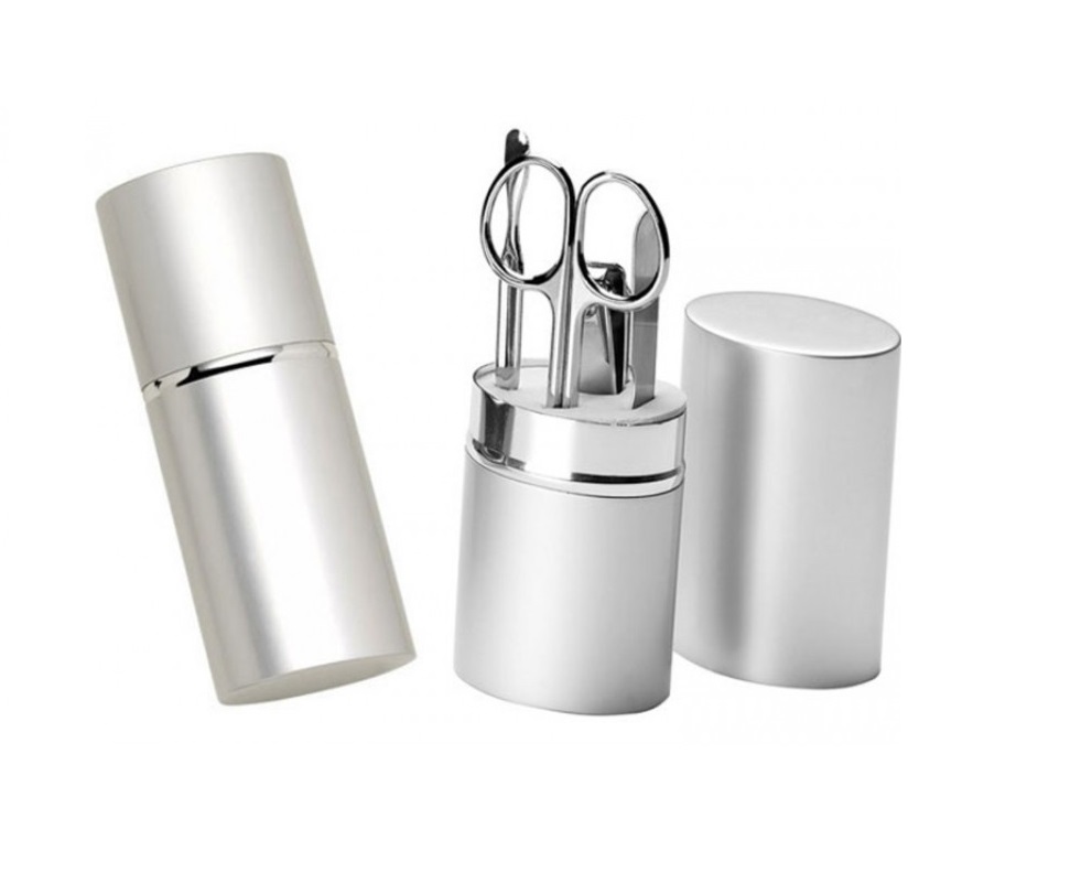Kit manicure com 4 peças e estojo de alumínio.Contém: 1 Cortador de unha, 1 Tesourinha,1 Empurrador de cutícula, 1 Lixa de unha. Gravação a laser.
