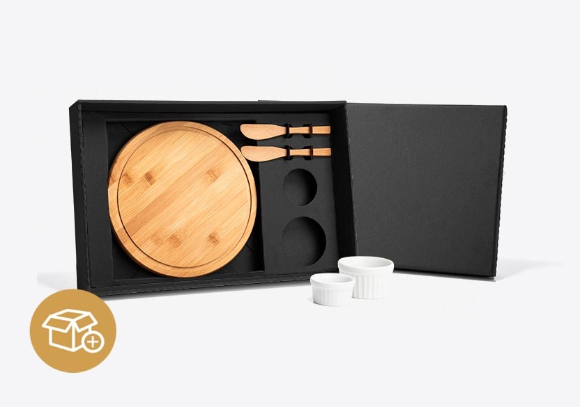 Kit para Petisco. Conta com tábua redonda com sulco e duas espátulas 14cm em Bambu; dois ramekins, um pequeno e um mini em Porcelana. Estão perfeitamente acomodados em uma caixa para presentear. Gravação a laser na tábua e serigrafia em 1 cor na tampa da caixa.