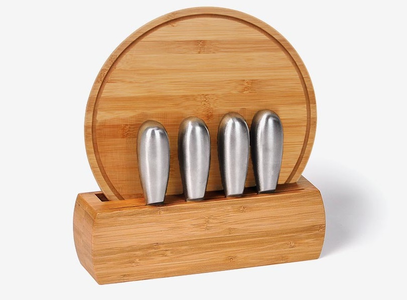 Conjunto para queijo em Bambu/Aço Inox. Conta com tábua, base, duas facas, sendo, uma com ponta e outra reta, garfo e espátula. Gravação a Laser na tábua,base e lamina das facas.