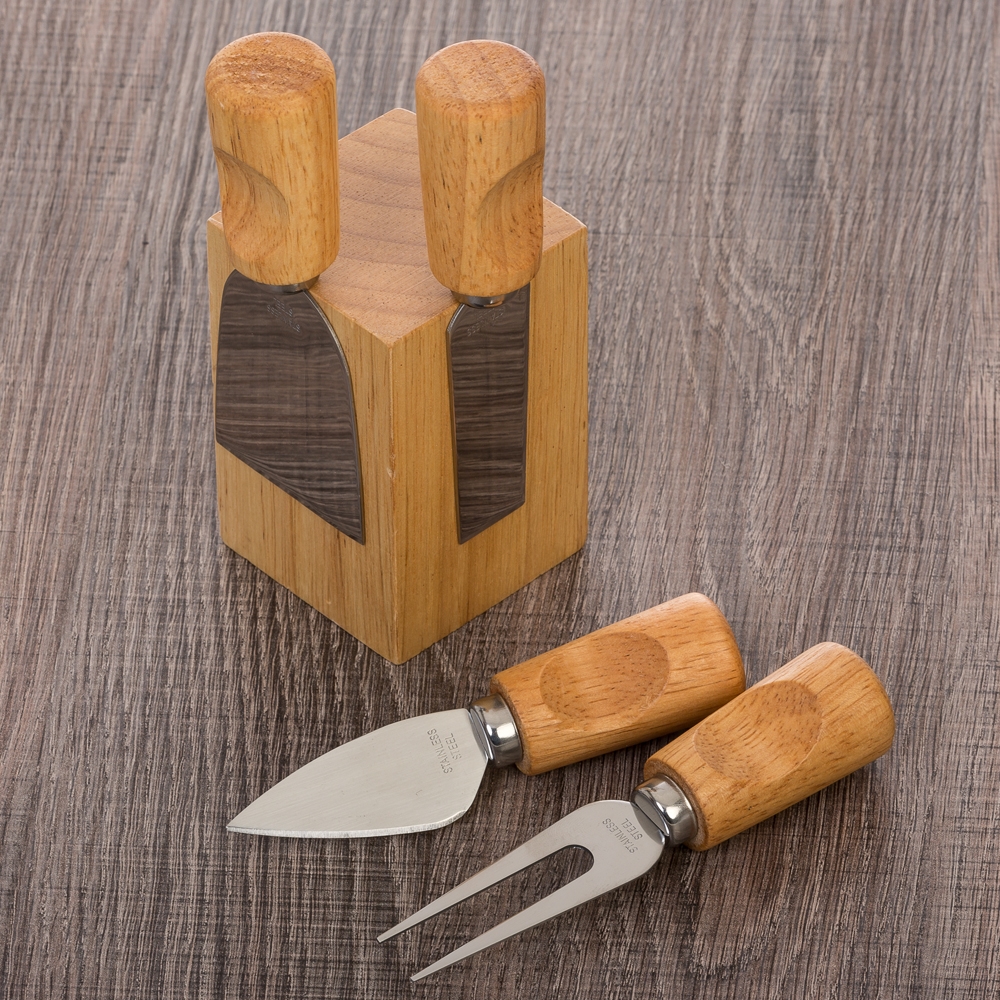 Kit queijo 4 peças com base de madeira com imãs. Possui: faca reta, faca com ponta, espátula e garfo inox com formato do polegador no cabo de madeira. Base retangular com quatro imãs superiores. Gravação a laser nos talheres e base em madeira.