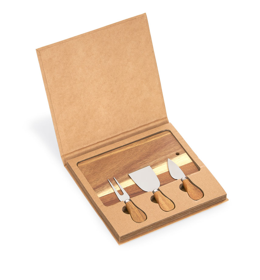 Kit queijo com 04 peças: faca, garfo, espatula e tábua de madeira retangular. Incluso Embalagem de papel kraft. Gravação a laser na tábua e lâmina das facas.