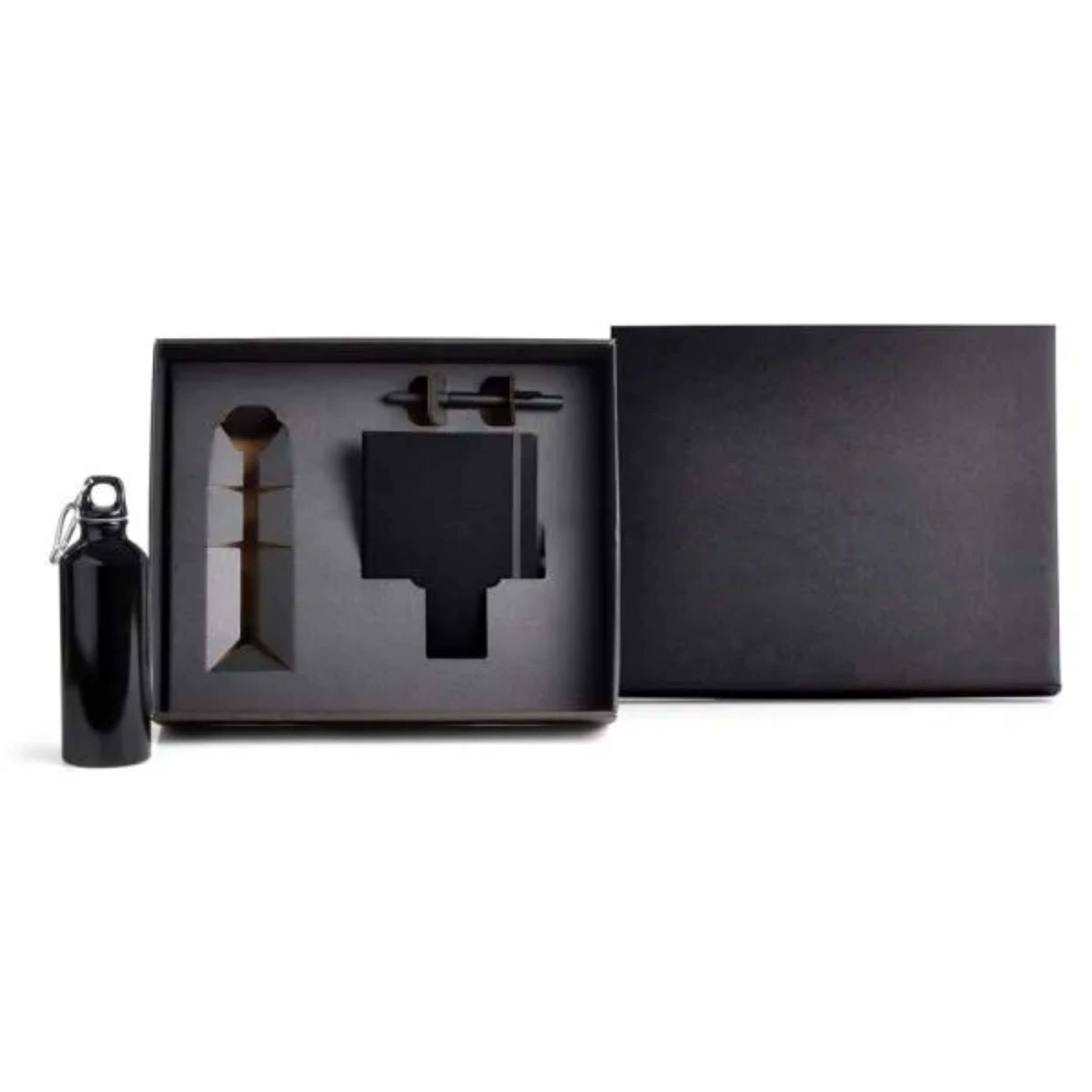 Kit squeeze, caderno e caneta. Composto por squeeze preto em alumínio revestido com verniz; caderno para anotações preto com capa dura e caneta esferográfica em ABS preta.