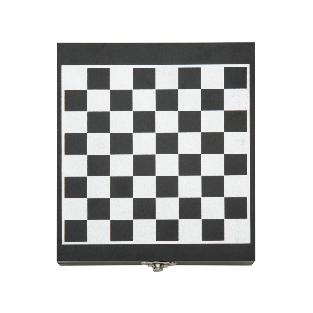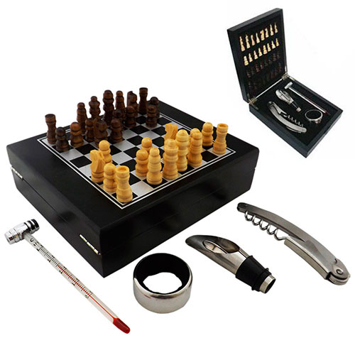 Kit vinho com 4 de peças e jogo de xadrez, possui 32 peças de xadrez sendo 16 marfim e 16 marrom, caixa de madeira na cor preto.Conteúdo: 1 Anel de gargalo, 1 Saca rolhas, 1 Tampa convencional, 1 Termômetro. Gravação a serigrafia no estojo e laser saca rolhas.