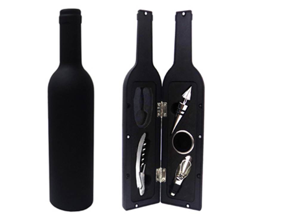 Kit vinho com 5 peças, estojo de plástico resistente.Conteúdo: 1 Anel de gargalo – 1 Tampa com bico – 1 Saca rolhas – 1 Cortador de lacre – 1 Tampa sem bico. Gravação serigrafia no estojo e laser no saca rolhas.