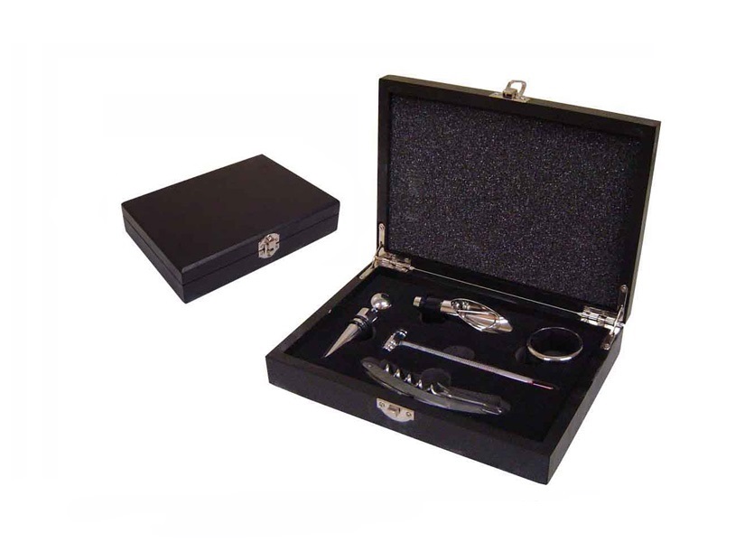 Conjunto com acessórios para vinho, 5 peças. Gravação serigrafia em 1 cor no estojo e laser no abridor saca rolhas.