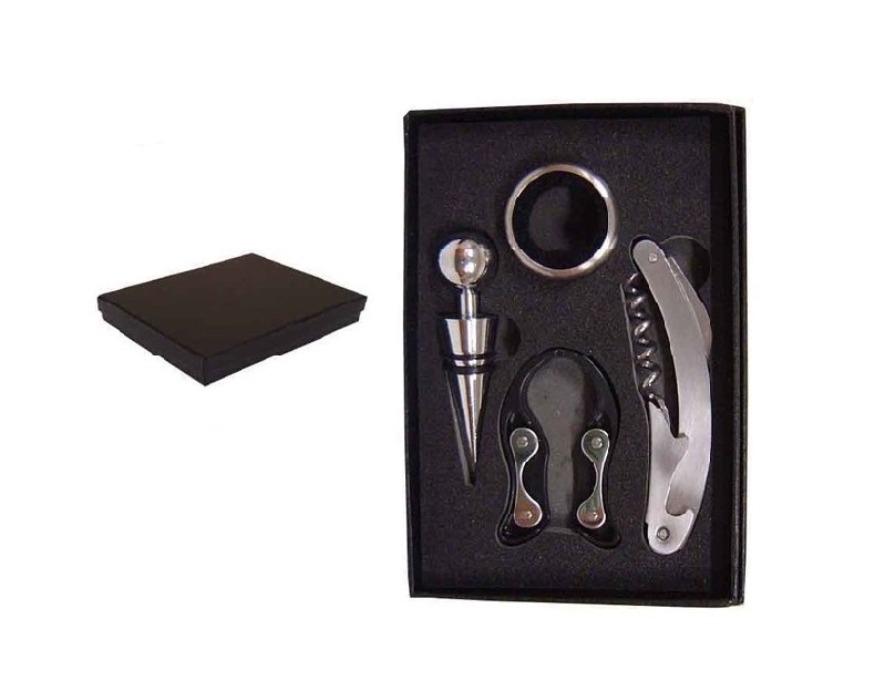 Conjunto com acessórios para vinho 4 peças. Gravação serigrafia em 1 cor no estojo, e laser no abridor saca rolhas.