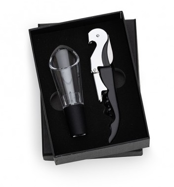 Kit vinho 2 peças em caixa de papelão com tampa, revestimento interno de espuma. Possui bico condutor e saca rolhas, medidas altura : 14 cm x Largura : 10,2 cm. Gravação serigrafia em 1 cor na caixa e laser no saca rolhas.