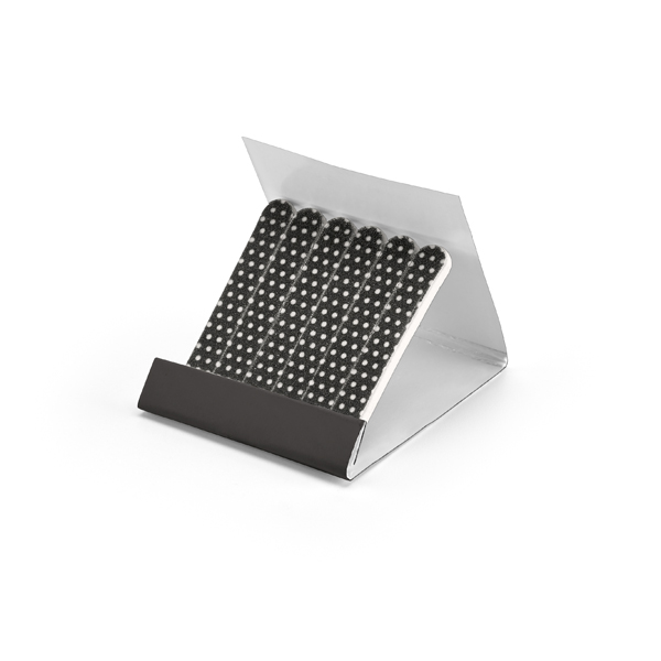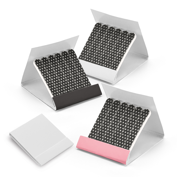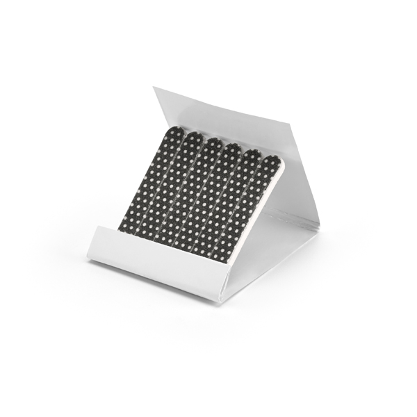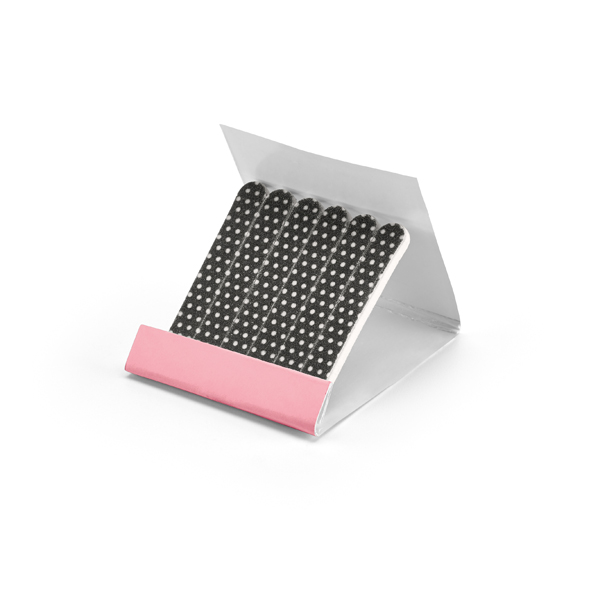 Kit de 6 lixas com embalagem caixa de papel cartão, medidas 55 x 61 x 6 mm. Gravação serigrafia em 1 cor.