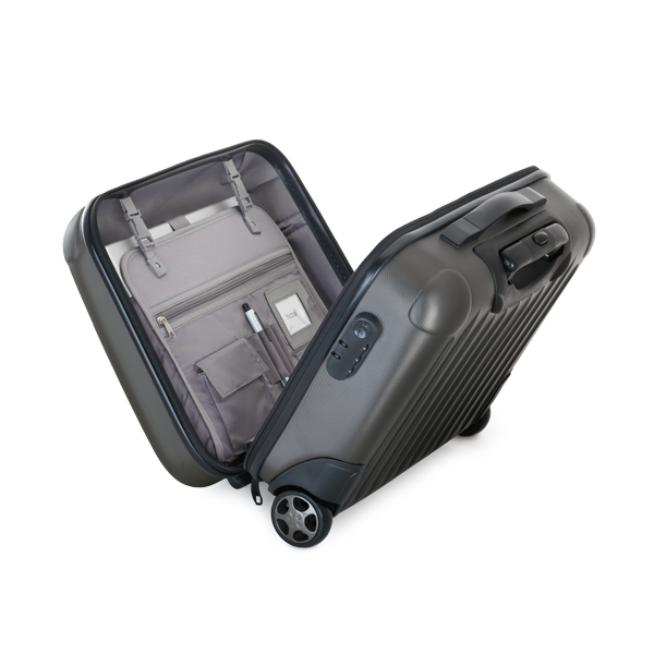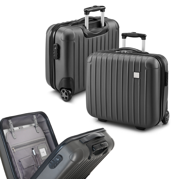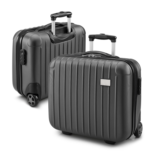 Mala de viagem executivo produzida em ABS com 4 rodas giratórias. Pega extensível em alumínio, com mola (altura da pega estendida: 435 mm). Fecho de segurança com senha, Interior forrado, com divisórias internas, medidas 390 x 590 x 200 mm. Gravação a laser em placa de metal.