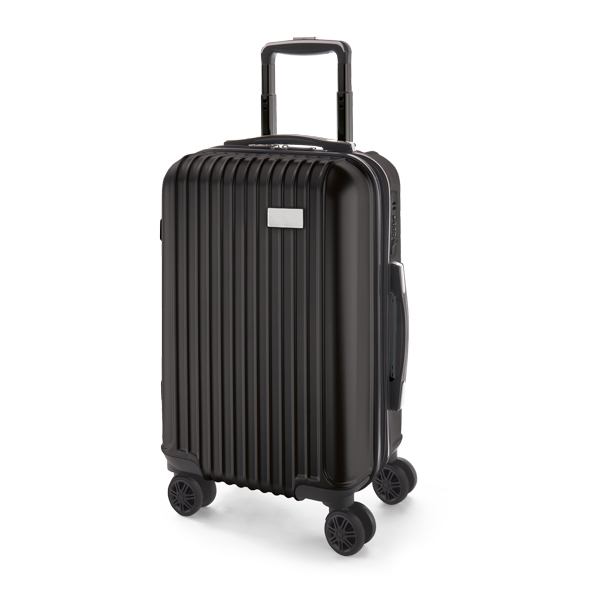 Mala de viagem executivo produzida em ABS e PET, interior forrado, com divisória, possui 4 rodas duplas giratórias, pega extensível em alumínio, com mola (altura pega estendida até 530 mm) e fecho de segurança com senha. Capacidade até 33 L. Peso: 2,70 kg, medidas 335 x 540 x 225 mm. Gravação a laser em placa de metal.