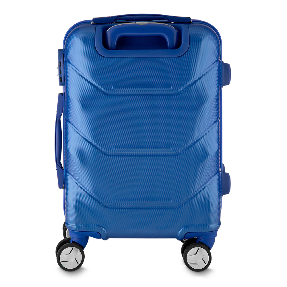 Mala viagem pequena produzida em ABS (Estireno de acrilonitrilo e butadieno) Forro interno em poliéster, possui sistema de carrinho de aço alça de mão e quatro rodas de 360 graus, medidas 48x22x35cm (s/rodas) 55x22x35cm (c/rodas e alça). Gravação a laser na placa de alumínio.