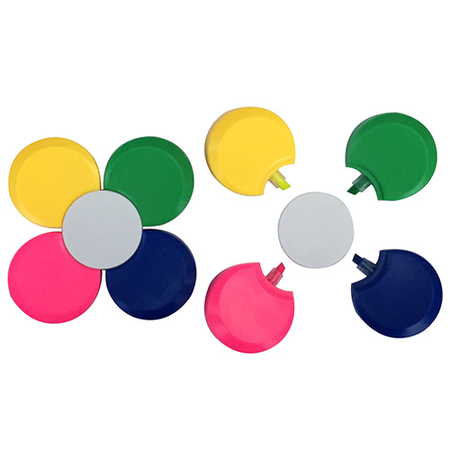 Conjunto de canetas marca texto plástico em formato de flor nas cores, rosa, azul, verde e amarelo. Gravação serigrafia.