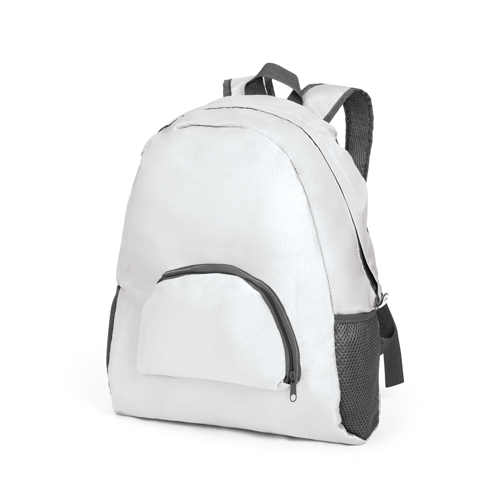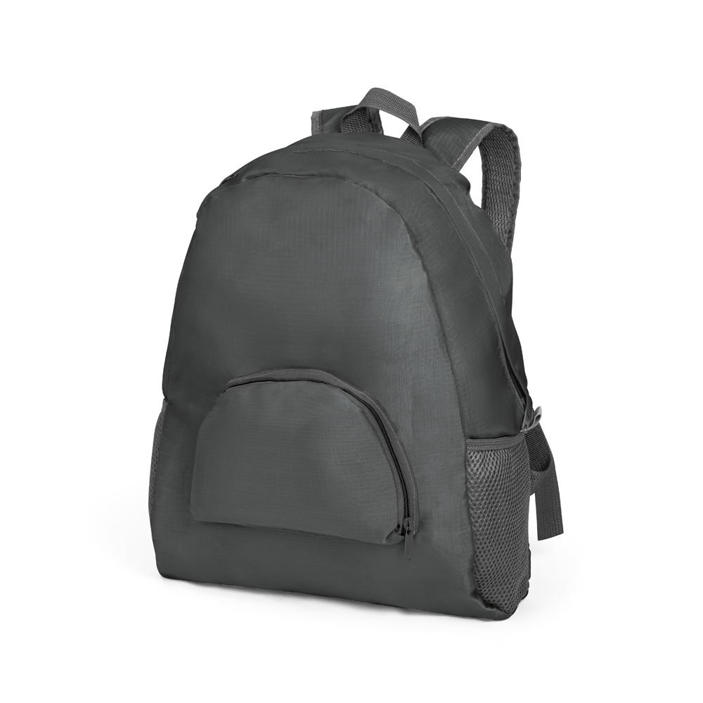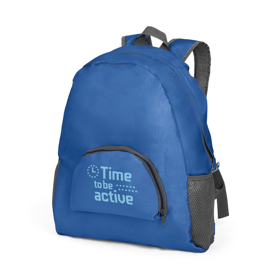 Mochila dobrável produzida em ripstop 210D, possui bolso frontal e dois bolsos laterais em tela, medidas 330 x 400 x 120 mm | Dobrada: 195 x 160 x 25 mm. Gravação serigrafia em 1 cor.