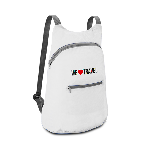 Mochila dobrável produzida em 210D ripstop com bolso frontal, fornecida desdobrada. 295 x 415 x 110 mm | Dobrada: 160 x 130 mm. Gravação serigrafia.