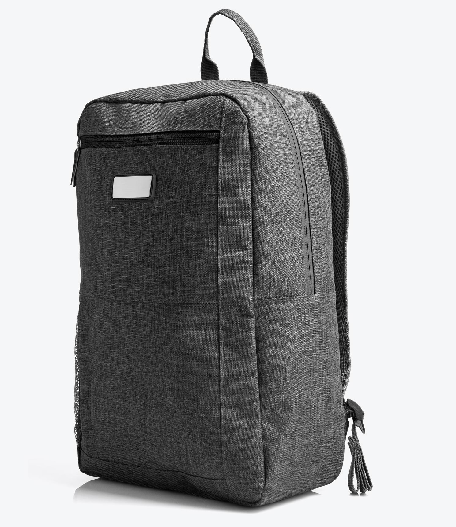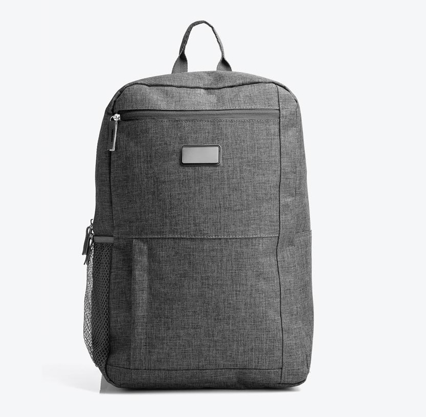 Mochila cinza em Poliéster 300D retangular Melange Cinza. Conta com alças para as costas, alça de mão, compartimento para notebook de até 15″, 3 bolsos externos com zíper e 1 bolsos externos em tela. Gravação a laser em placa de metal.