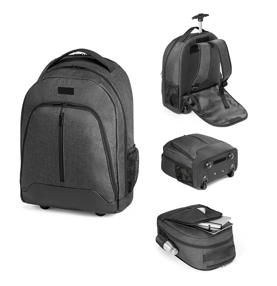 Mochila trolley para noteboo produzida em poliéster 600D de alta densidade e poliéster 600D impermeável, com compartimento para notebook até 15.6”. Possui bolso frontal com zíper e bolsos laterais com tela, e protetor de rodas. Pega extensível em metal, parte posterior e alças almofadadas, medidas 340 x 430 x 170 mm. Gravação a laser na placa de metal.