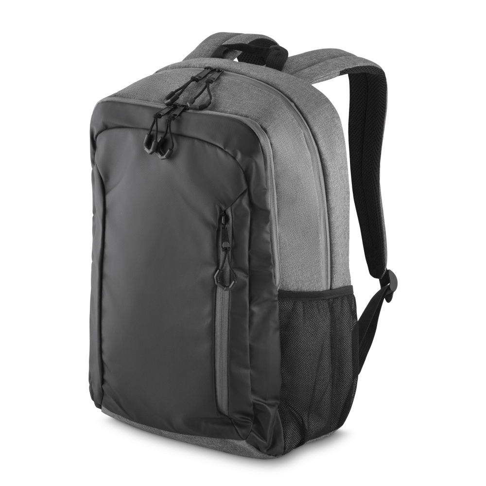 Mochila com compartimento notebook produzida no tecido nylon, dois bolsos laterais em malha, dois bolsos frontal, porta notebook, alça de mão e de ombro, costas acolchoado. Gravação a laser em placa de metal.