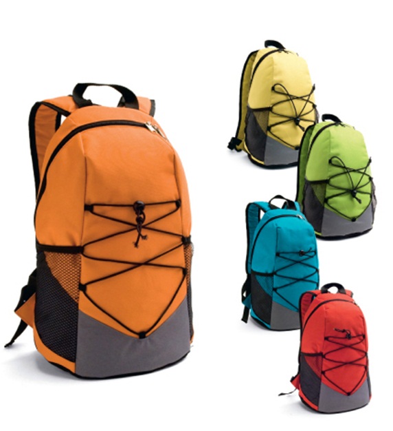 Mochila produzida em poliéster 600D com bolsos laterais em rede e bolso interior, possui parte posterior almofadada, medidas 250 x 420 x 160 mm. Gravação serigrafia em 1 cor.