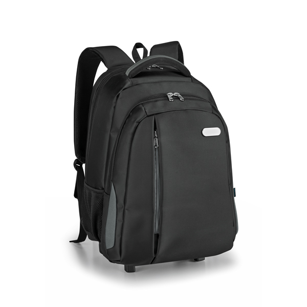 Mochila trolley para notebook. Nylon 999. Material à prova de água. Compartimento principal almofadado para notebook até 17”. Segundo compartimento forrado e com diversos bolsos. Bolso frontal com zíper e bolsos laterais com tela. Com estrutura removível e 2 rodas. Pega extensível em alumínio, com mola (altura da pega estendida: 550 mm). Gravação a laser em chapa metálica. Medidas 350 x 460 x 210 mm .